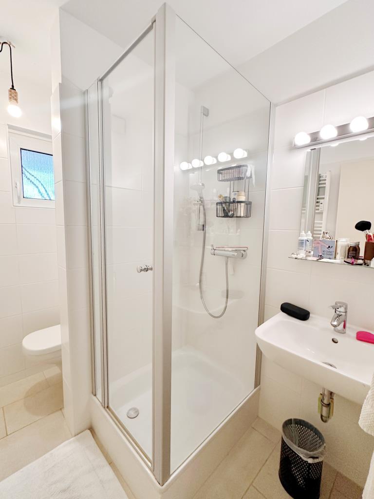 Das helle Badezimmer mit Fenster ist modern gehalten und mit einer Dusche, einem Handwaschbecken, einem WC und einem Handtuchheizkörper ausgestattet.