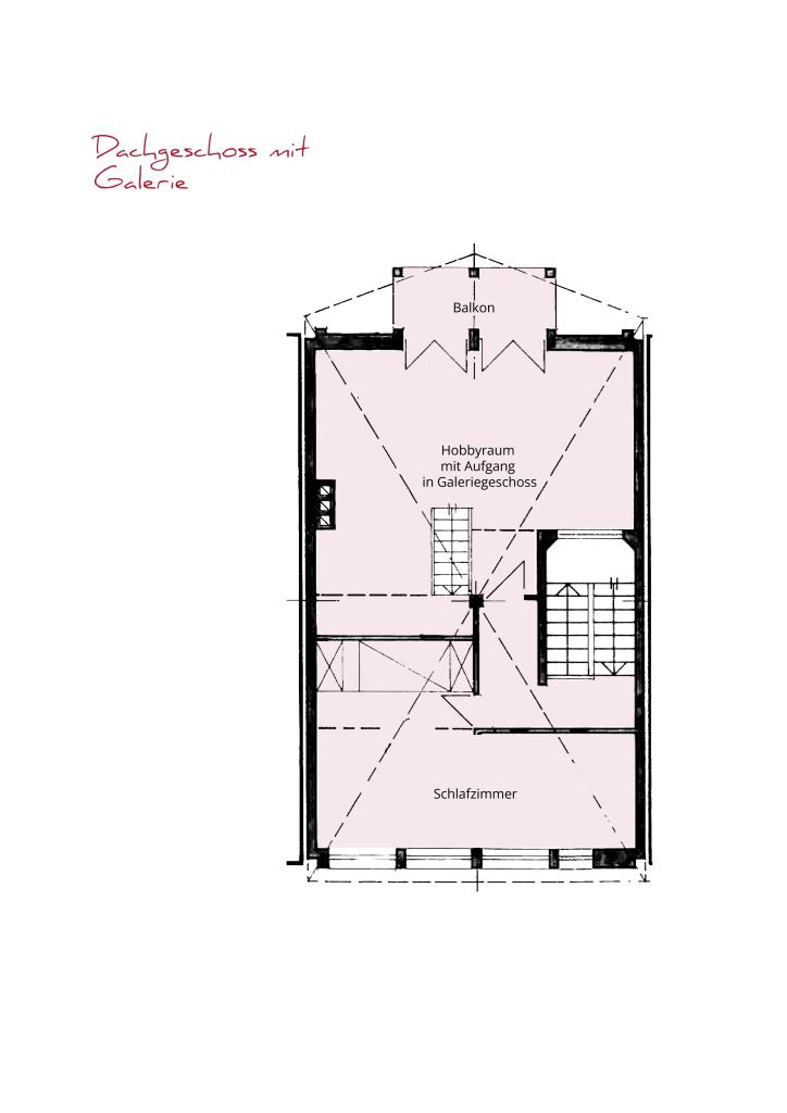 Hauptgebäude über drei Ebenen: Erdgeschoss, Obergeschoss, Dachgeschoss