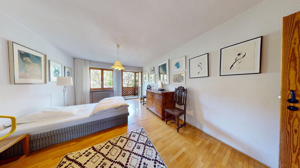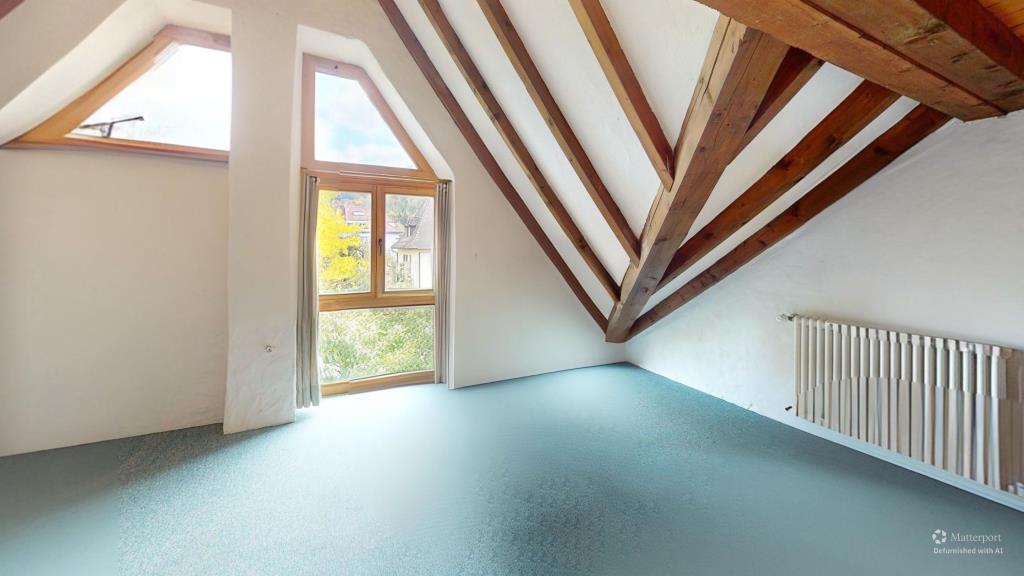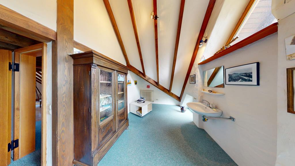 Im Dachgeschoss lassen sichtbare Holzbalken, eine offene Galerie, zwei weitere Zimmer und ein zusätzlicher Balkon den Raum besonders attraktiv erscheinen.