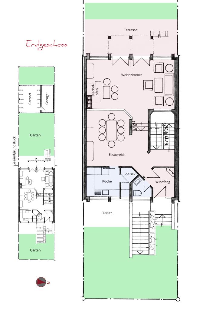 Im Erdgeschoss erwarten Sie ein gemütlicher, heller Wohnbereich mit funktionalem Kachelofen, ein direkter Zugang zur Terrasse mit Blick ins Grüne, eine Küche mit EBK und ein Gäste-WC.